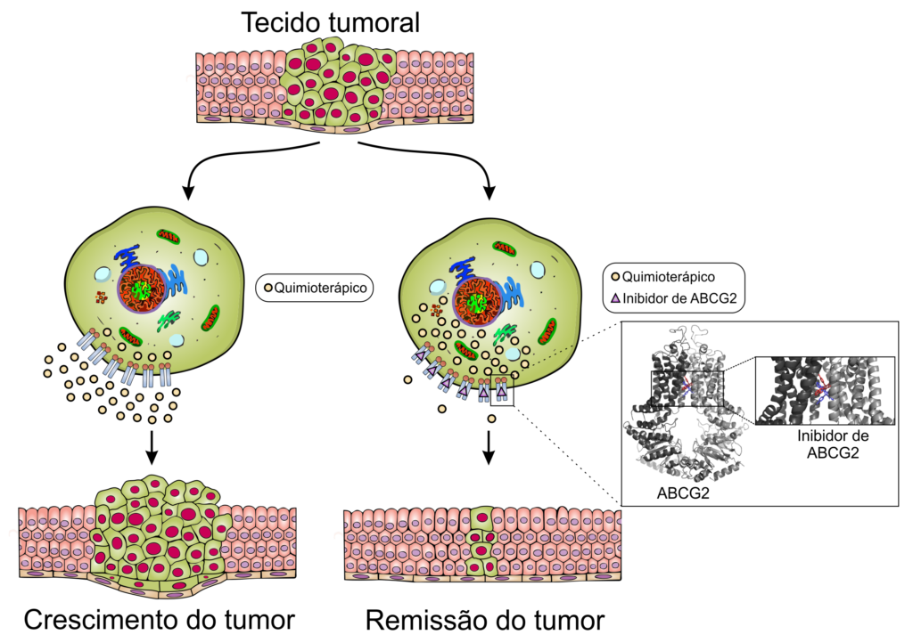 As comprovadas evidências cientÃficas associando a superexpressão de transportadores ABC com a falha de resposta ao tratamento quimioterápico, motivou a pesquisa de inibidores desses transportadores ABC. Nas últimas décadas, grandes esforços têm sido investidos na identificação de inibidores dos três principais transportadores ABC relacionados diretamente ao fenômeno de MDR (P-gp, MRP1 e ABCG2). Dentre os três, o transportador ABCG2 é o principal alvo estudado pelo laboratório. O transportador ABCG2 foi o mais recentemente descoberto e, por esta razão, seu processo de desenvolvimento e caracterização de inibidores especÃficos encontra-se em situação menos avançada. Sua recente elucidação estrutural em alta resolução permitirá um delineamento mais acurado e possivelmente mais assertivo para identificação de novos inibidores especÃficos. O laboratório já identificou um dos mais potentes inibidores seletivos para esse transportador.